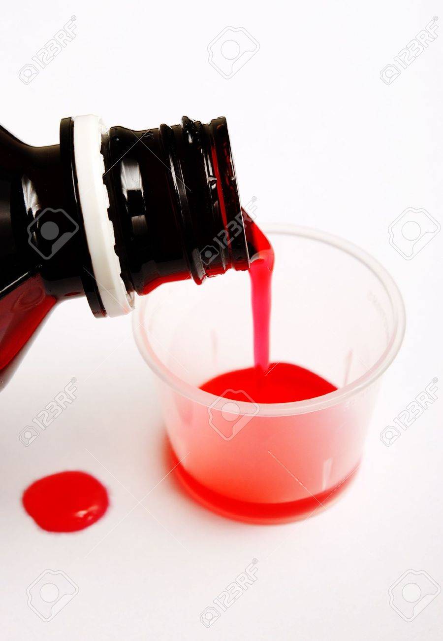 Plastic cup of red cough syrup. You feel nauseated when you have a cough stuck in your throat. This is a very tasty and natural remedy for dry cough.