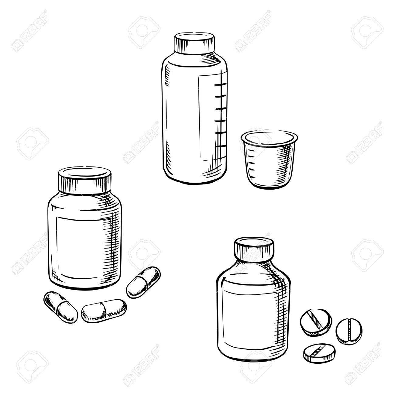 Medical Bottles With Pills Capsules And Cough Syrup With Measuring Royalty Free Cliparts Vectors And Stock Illustration Image 47406773
